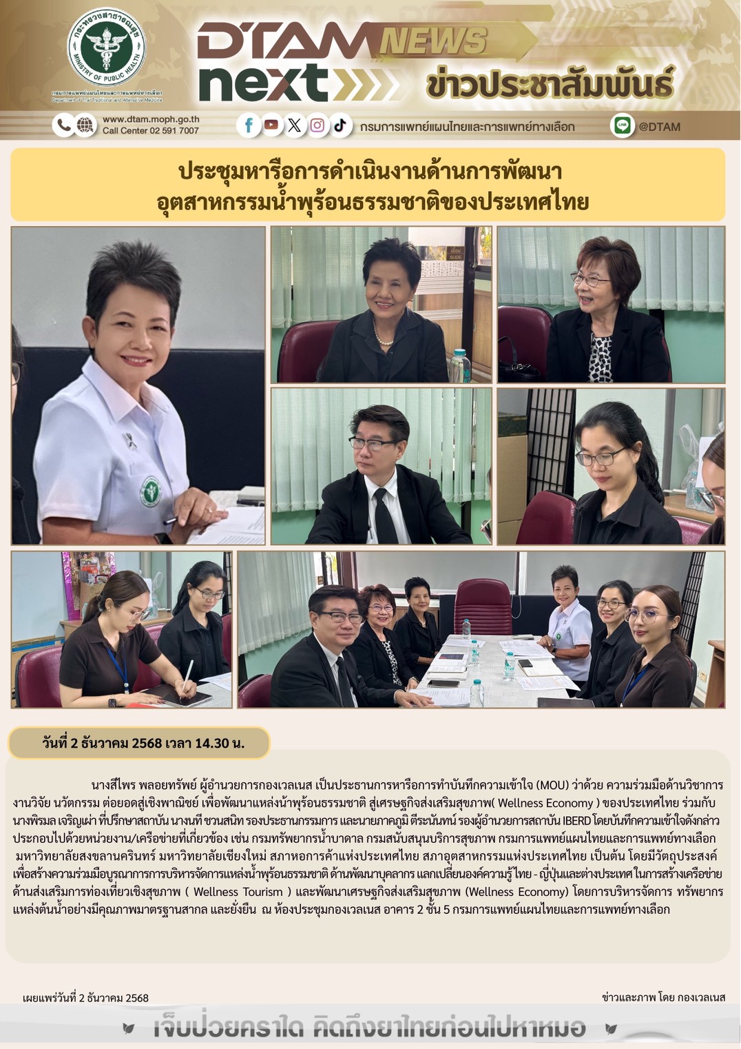 นางสีไพร พลอยทรัพย์ ผู้อำนวยการกองเวลเนส เป็นประธานการหารือการทำบันทึกความเข้าใจ (MOU) ว่าด้วย ความร่วมมือด้านวิชาการ งานวิจัย นวัตกรรม ต่อยอดสู่เชิงพาณิชย์ เพื่อพัฒนาแหล่งน้าพุร้อนธรรมชาติ สู่เศรษฐกิจส่งเสริมสุขภาพ( Wellness Economy ) ของประเทศไทย ร่วมกับนางพิรมล เจริญเผ่า ที่ปรึกษาสถาบัน นางนที ชวนสนิท รองประธานกรรมการ และนายภาคภูมิ ตีระนันทน์ รองผู้อำนวยการสถาบัน IBERD โดยบันทึกความเข้าใจดังกล่าว ประกอบไปด้วยหน่วยงาน/เครือข่ายที่เกี่ยวข้อง เช่น กรมทรัพยากรน้ำบาดาล กรมสนับสนุนบริการสุขภาพ กรมการแพทย์แผนไทยและการแพทย์ทางเลือก มหาวิทยาลัยสงขลานครินทร์ มหาวิทยาลัยเชียงใหม่ สภาหอการค้าแห่งประเทศไทย สภาอุตสาหกรรมแห่งประเทศไทย เป็นต้น โดยมีวัตถุประสงค์ เพื่อสร้างความร่วมมือบูรณาการการบริหารจัดการแหล่งน้ำพุร้อนธรรมชาติ ด้านพัฒนาบุคลากร แลกเปลี่ยนองค์ความรู้ ไทย - ญี่ปุ่นและต่างประเทศ ในการสร้างเครือข่ายด้านส่งเสริมการท่องเที่ยวเชิงสุขภาพ ( Wellness Tourism ) และพัฒนาเศรษฐกิจส่งเสริมสุขภาพ (Wellness Economy) โดยการบริหารจัดการ ทรัพยากรแหล่งต้นน้ำอย่างมีคุณภาพมาตรฐานสากล และยั่งยืน ณ ห้องประชุมกองเวลเนส อาคาร 2 ชั้น 5 กรมการแพทย์แผนไทยและการแพทย์ทางเลือก